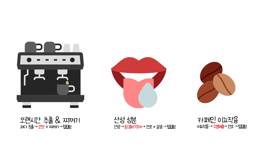 또한 커피는 산성을 띠는 음료이기 때문에 산성 성분이 입안에서 침 분비를 감소시키면 이로 인해 커피를 마신 뒤 입안이 건조해지고, 갈증이 나고 텁텁함이 느껴질 수 있다.