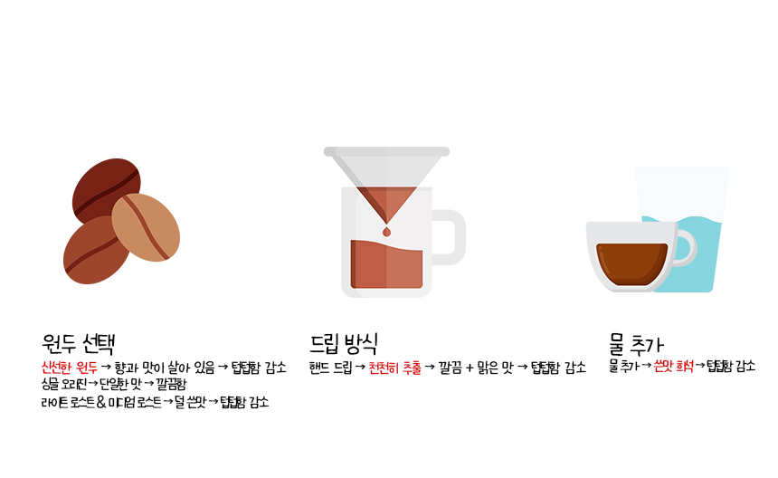 또한 커피머신을 사용하지 않고 드립 방식으로 천천히 커피를 내리는 것도 상대적으로 깔끔한 맑은 맛을 낼 수 있으므로 커피를 마신 후의 텁텁함이 싫다면 핸드 드립 커피로 마시는 게 좋다.