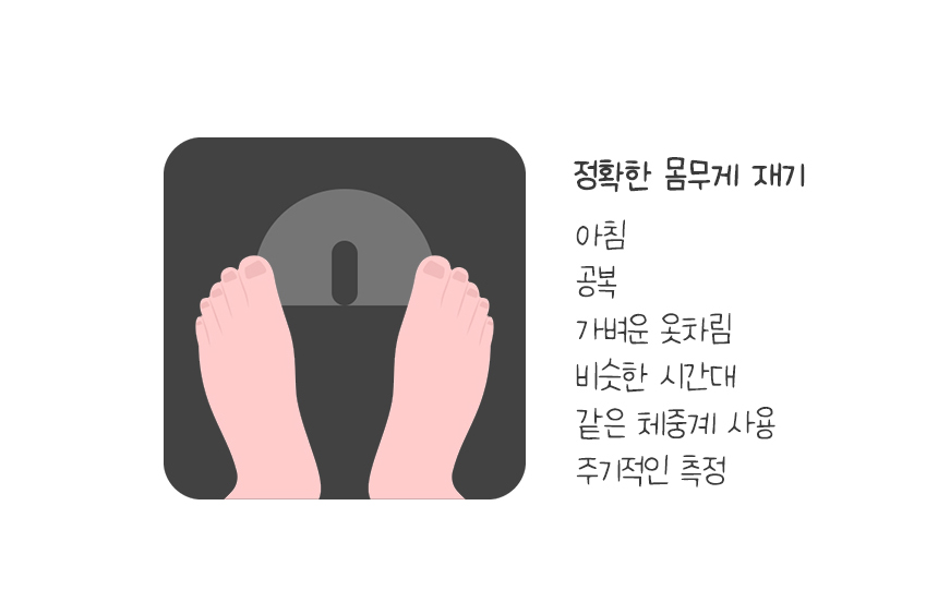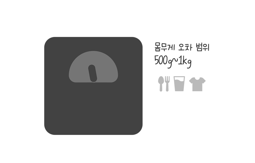 몸무게를 잴 때는 옷의 착용과 식사 여부에 따라 오차를 보이므로 정확한 몸무게를 재기 위해서는 아침에 일어나서 공복상태에서 측정해야 한다.