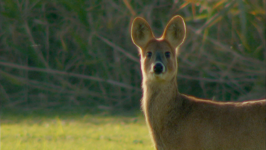 수컷 고라니 : 수컷 고라니는 위턱에서 5cm 앞으로 돌출된 송곳니는 있지만 뿔은 없다.