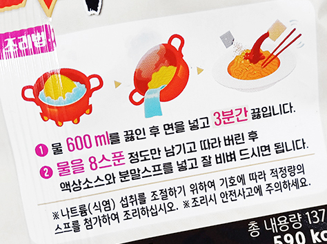 신라면 툼바는 봉지라면 기준으로 137g, 590kcal 제품으로 면과 액상소스, 분말소프 등이 들어있다.