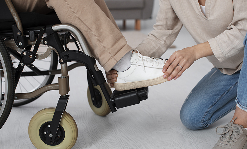 휠체어 사용자를 보조하는 자는 휠체어의 잠금장치와 발 받침대를 주의해 펴거나 접을 수 있어야 한다.