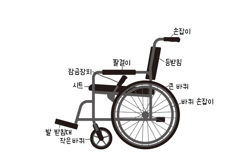 손잡이 : 휠체어 뒤쪽에 위치하며, 보조자가 휠체어를 밀 때 사용하는 부분.