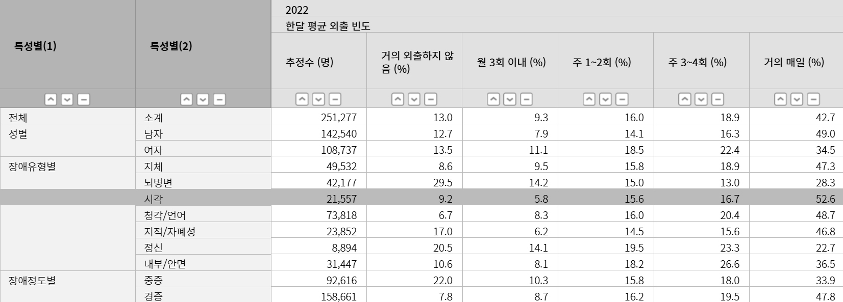 이를 종합해 보면 시각장애인의 외출 빈도는 전혀 외출하지 않는 것은 아니지만 비장애인과 비교했을 때 상대적으로 낮은 경향이 있음을 알 수 있다.
