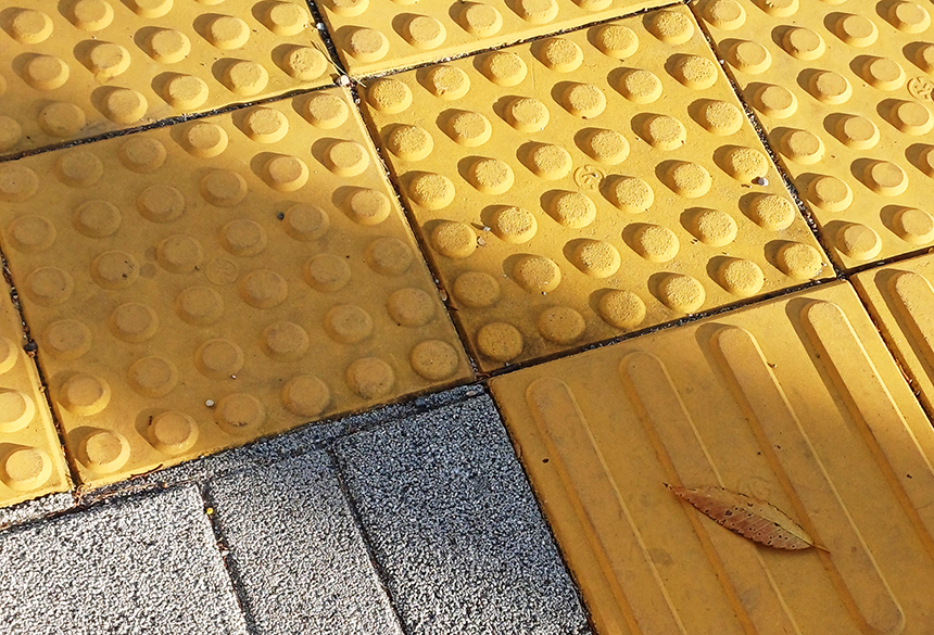 시각장애인의 보행 안전 및 유도를 위해 바닥, 도로 등에 설치되는 점자블록은 보도를 횡단하는 차량 진,출입부에 설치되도록 법으로 규정되어 있다.