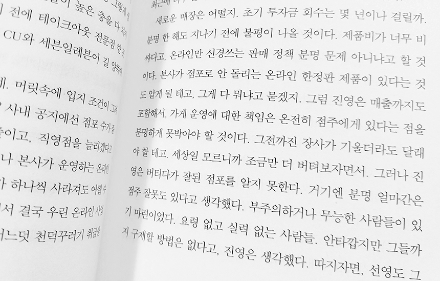 같은 주인공의 심리가 이어지다 진영이 관리하는 가맹점포 점주와 대화하는 장면이 나온다.