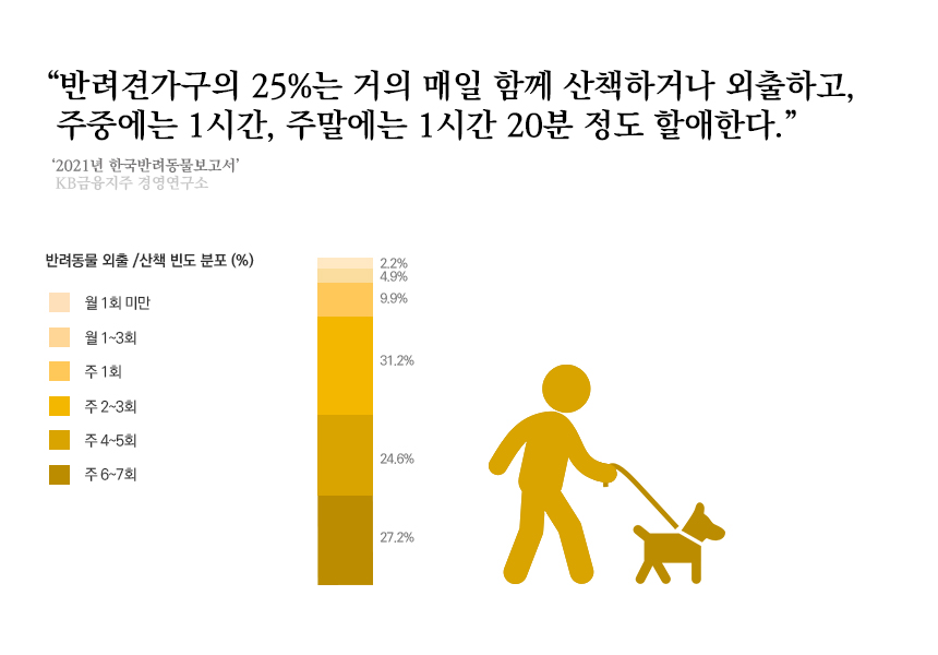 "반려견가구의 25%는 거의 매일 함께 산책하거나 외출하고, 주중에는 1시간, 주말에는 1시간 20분 정도 할애한다."