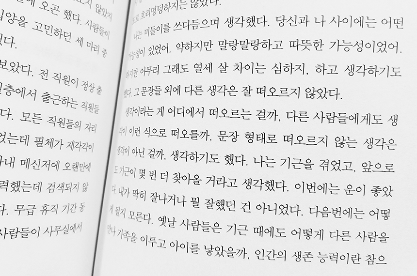 "생각이라는 게 어디에서 떠오르는 걸까, 다른 사람들에게도 생각이 이런 식으로 떠오를까, 문장 형태로 떠오르지 않는 생각은 생각이 아닌 걸까, 생각하기도 했다."