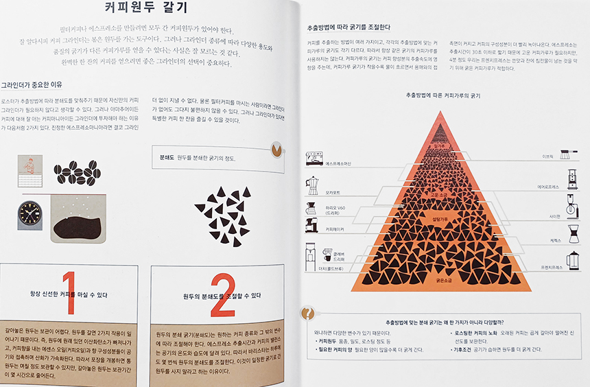 커피추출을 크게 에스프레소와 필터커피로 나누고, 기본 변수인 원두 분쇄 굵기, 커피가루의 양, 물양, 추출온도, 추출시간, 추출량 등을 정확히 맞추어 커피의 향미를 온전히 추출하는 방법을 알려준다.