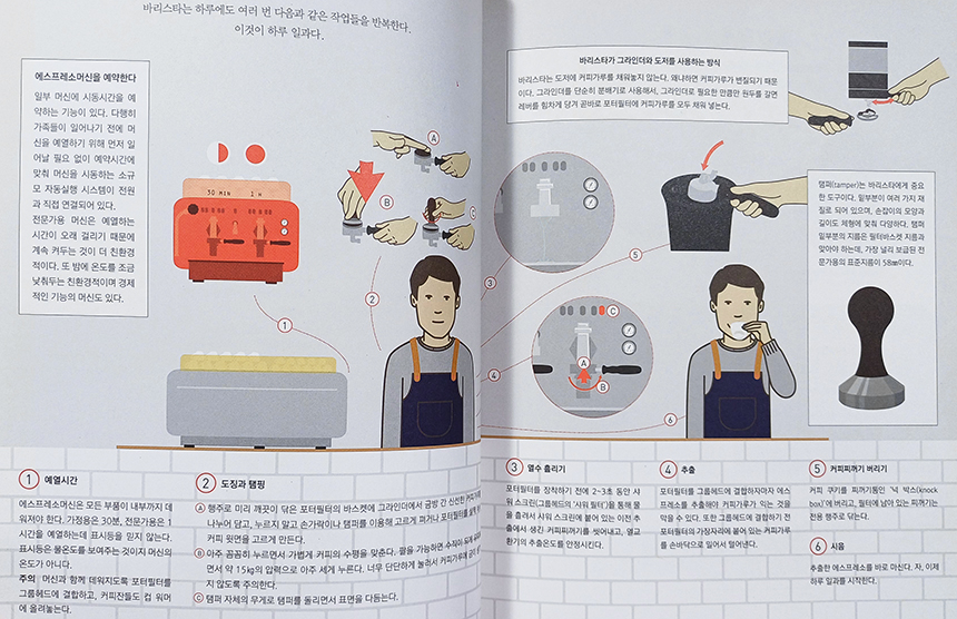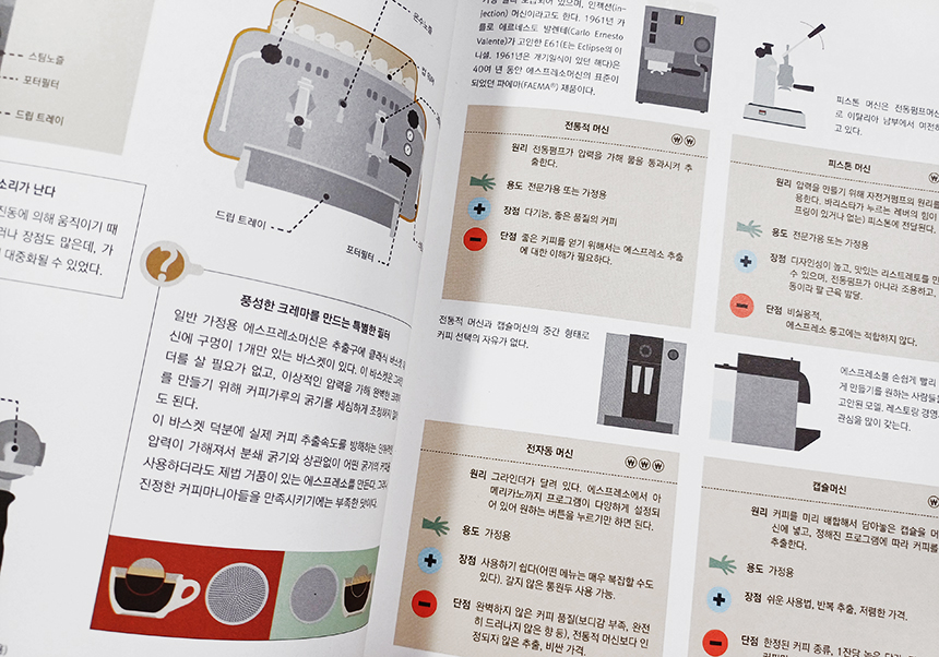 대략적으로 알던 커피더라도 커피 재배, 생산국, 품종부터 추출, 로스팅, 커피 머신, 커피 종류, 커피와 관련한 직업까지 커피에 관한 여러 가지 내용을 쉽고도 전문적으로 다뤄 개념 잡기에 좋았다.