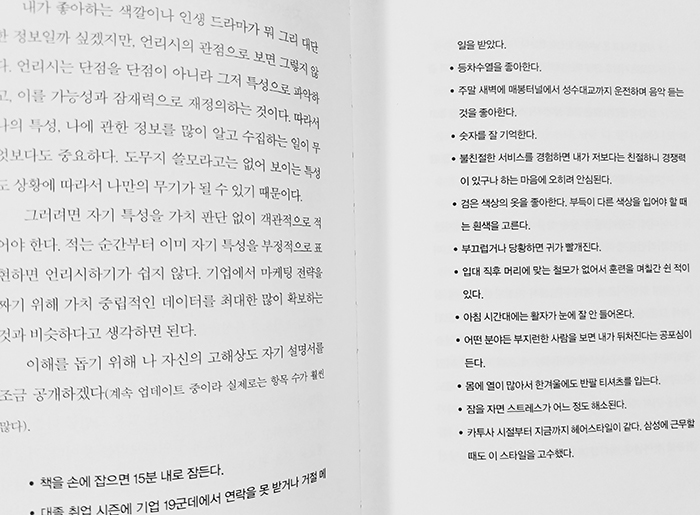 그러므로 일반적인 신념처럼 자기계발을 통해서만 줄곧 자신을 업그레이드할 수 있다고 믿고 있었다면, 새로운 것을 개발하기 보다는 이미 자신이 가진 것을 재정의 하고 발견해내는 것만으로도 충분히 다른 가능성도 있을 수 있다는 것을 이 책을 통해 깨달을 수 있다.