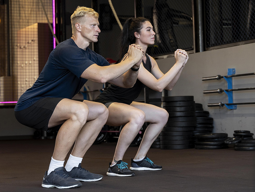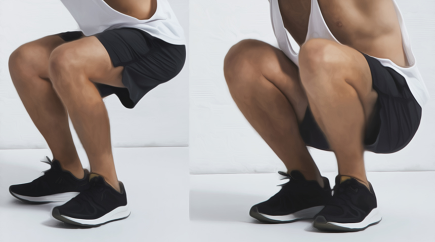 올바른 스쿼트 자세는 엉덩이를 뒤로 빼면서 구부리고 무릎이 발끝이 넘어가지 않도록 해야 한다.