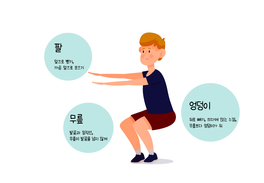 따라서 엉덩이를 뒤로 빼면서 의자에 앉는 듯한 느낌을 유지하고 팔을 이용해 균형을 잡으며 반복하는 것이 스쿼트의 올바른 자세라고 할 수 있다.