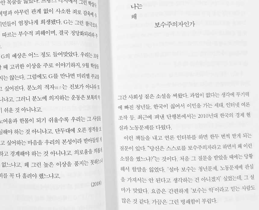 그래서 만약 보수주의자가 우파라서 그렇다면 그건 정말 '너는 가진 게 있으니까 급하지 않은 거야, 너는 당해보지 않아서 서럽지 않은 거야'에 걸맞은 삶을 살아왔기 때문은 아닐까.