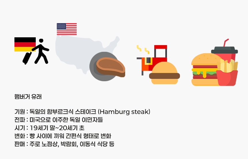 따라서 햄버거의 유래는 독일의 요리에서, 독일 이민자들에 의해, 미국에서 노점상과 박람회 등에서 간편히 먹을 수 있는 음식으로 빵과 빵 사이에 함부르크 스테이크를 넣어 팔기 시작한 것에서부터 비롯되었다고 말할 수 있다.
