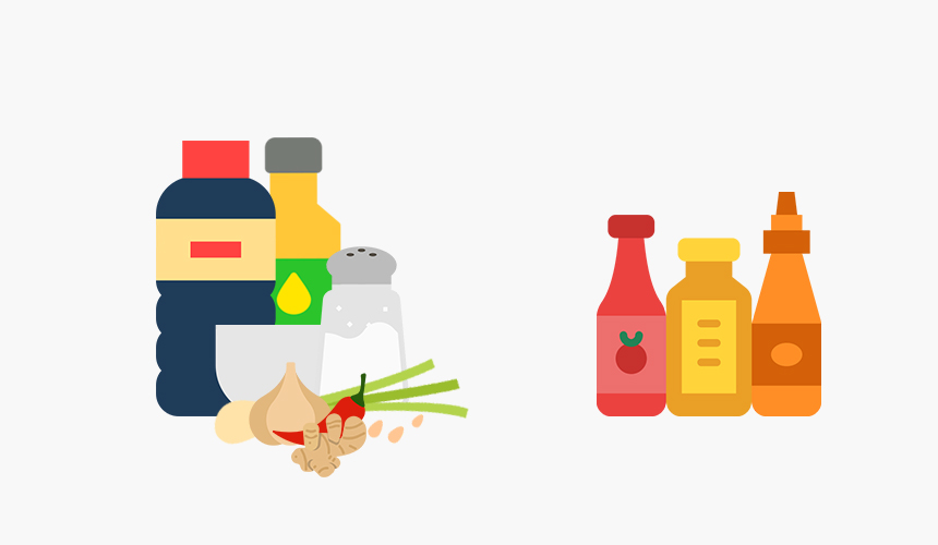 : 멸치가루, 고춧가루, 다시마, 액젓(새우젓, 멸치액젓, 참치액젓), 미림, 조청, 꿀, 물엿, 올리고당, 매실액, 매실청, 청주, 생강, 배즙, 레몬즙, 겨자가루, 들기름, 쌈장, 청국장, 액상 양념(간장, 고추장, 된장), 조미분말, MSG, 치킨스톡, 카레가루, 케찹, 마요네즈, 머스터드 소스, 와사비, 고추기름, 굴소스, 칠리소스, 타바스코 소스, 스리라차 소스, 바비큐 소스, 드레싱 소스(오리엔탈 드레싱, 참깨 드레싱, 유자 드레싱 등), 데리야끼 소스, 타르타르 소스 등