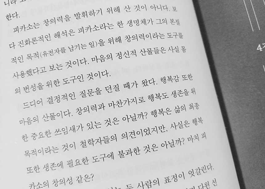 일단 책은 '행복은 생존을 위한 도구'라는 요지라는 것이 단번에 파악될 정도로 쉽고 행복에 관한 생각조차 불필요할 정도로 단순하다.