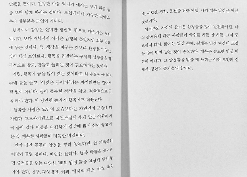 행복을 유발하는 구체적 상황들을 적극적으로 찾고, 만들고 늘리는 것이 필요하다는 것이다."