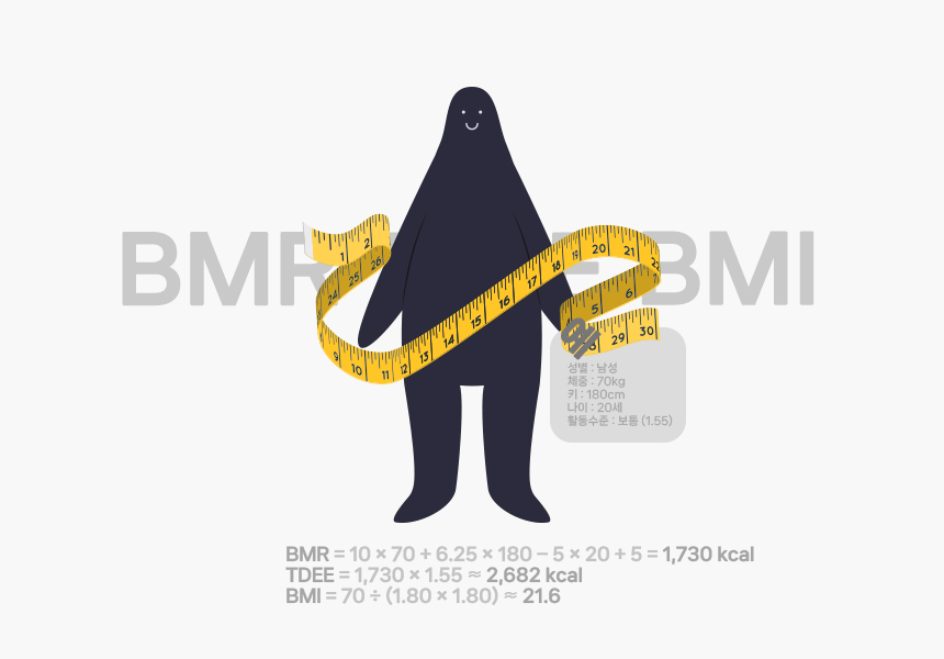 체질량지수(BMI), 기초대사량(BMR), 총 에너지 소비량(TDEE)은 개인의 건강 상태나 다이어트, 운동 계획 등을 세우는 데 유용한 지표로 활용되며 각각의 계산법은 다음과 같다.