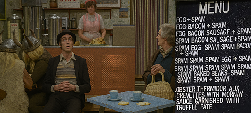 해당 장면에서는 식당 메뉴에 스팸이 과도하게 등장하고 이를 지적할 틈도 없이 "스팸, 스팸, 스팸!" 하고 연속적으로 외치는 장면이 연출된다.