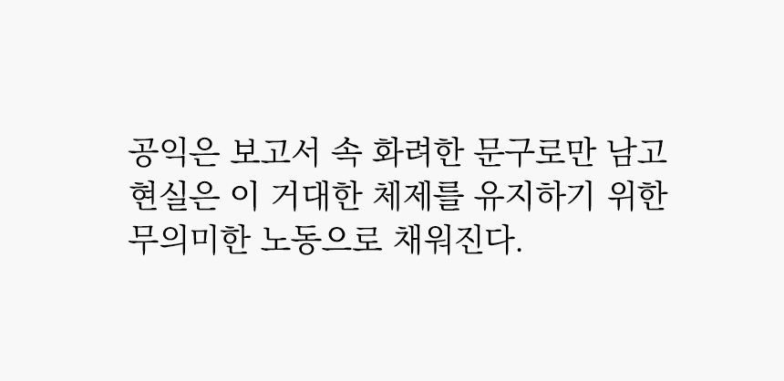더 나아가 누군가는 외려 나를 힐난할지도 모르겠다. 우리 모두 각자의 자리에서 먹고살기 위해 이 정도의 병폐는 애써 외면하며 살아가는데, 혼자 너무 유난인 것 아니냐고 말이다.