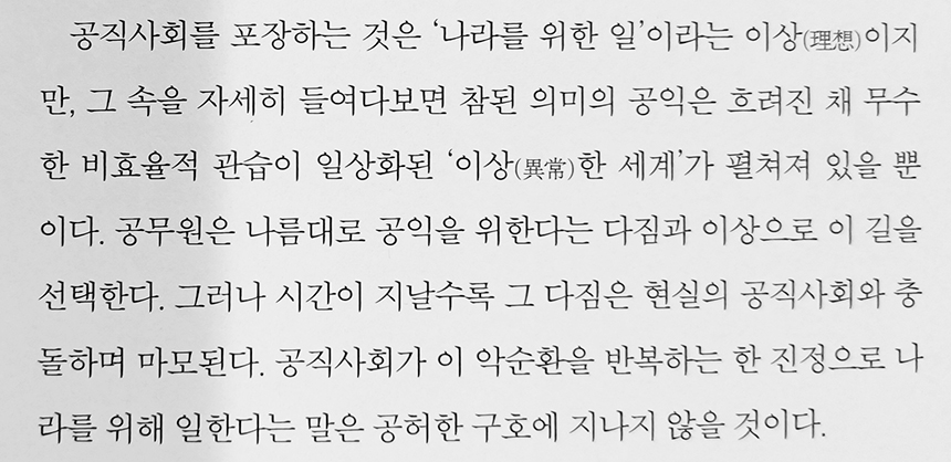 그럼에도 불구하고 정말 나라를 위해서 일하는 공무원도 있을 것이므로 저자가 말한 바가 공무원의 모든 것을 대변할 수 있다고 생각하지는 않는다.