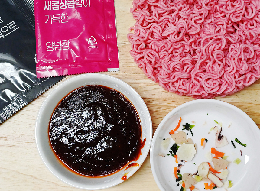 그런데 면이 오징어색을 닮긴 했지만 오징어 맛이 많이 느껴지는 면이라기보다는 특색있는 면의 차별화를 위해 이렇게 만든 것으로 보인다.