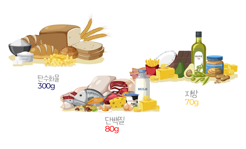 다만 이를 단순화하면 탄수화물은 하루에 300g, 단백질은 80g, 지방은 70g 이내로 먹는다고 생각할 수 있다.