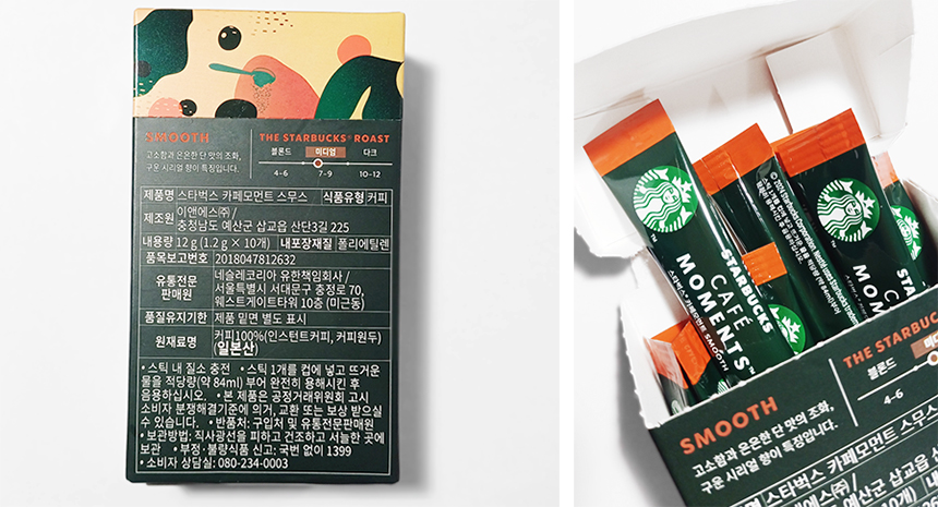스타벅스 카페모먼트 스무스 스틱커피에는 12g짜리 10개가 들어있다.