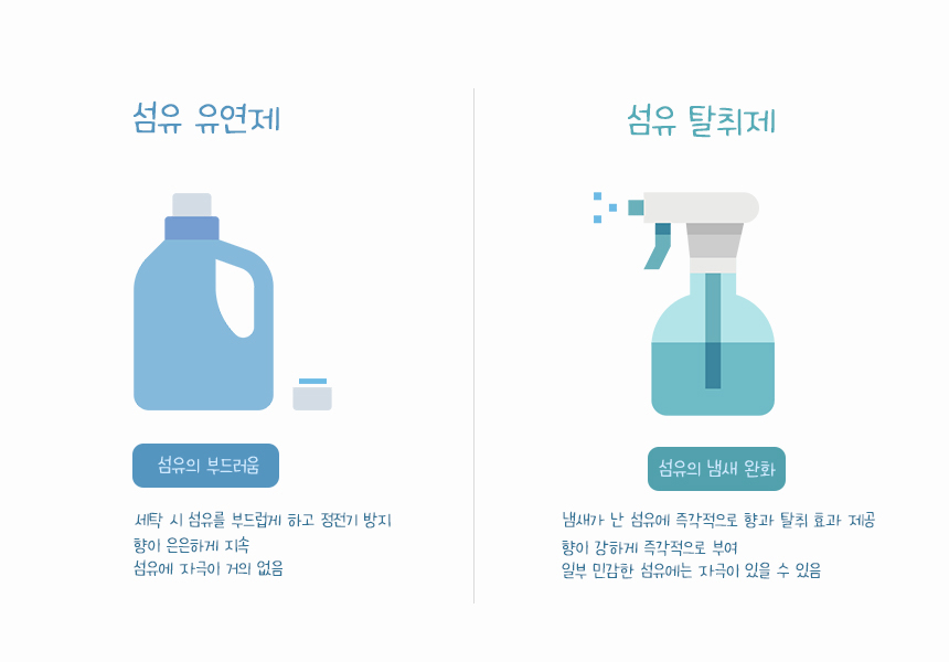 용도 면으로 보면 옷감의 섬유를 상하지 않게 하는 섬유유연제와 냄새를 없애주는 섬유탈취제는 다르다.