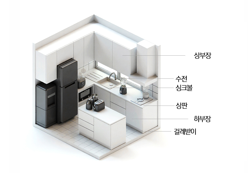 하부장 : 상판과 싱크볼, 배관을 받치며 아래쪽 벽면에 붙는 수납장.