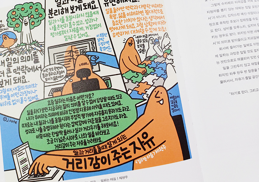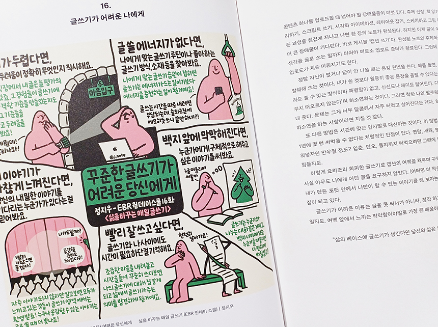 '한 페이지'라는 책의 제목에서 알 수 있듯이 인스타그램(@_j.note)에서 이미지인 피드로 볼 수 있는 내용이기도 하다.