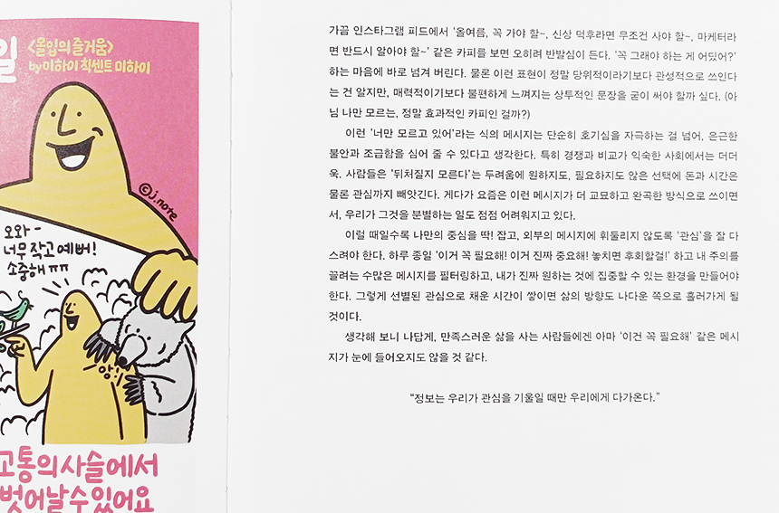 물론 본래 이 내용을 처음 싣던 채널이 인스타그램이라는 소셜미디어였기 때문에, 피드에서 봤다면 글이 많은 그림도 이렇게까지 복잡하게 느껴지지 않았을 수 있다.