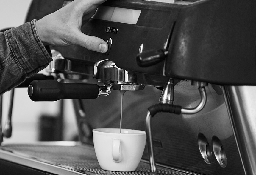 머신의 설계: 캡슐커피 머신은 보통 에스프레소(짧게)와 룽고(길게) 버튼이 설정되어 있어 버튼에 따라 물의 양과 추출 시간이 자동으로 조절된다.
