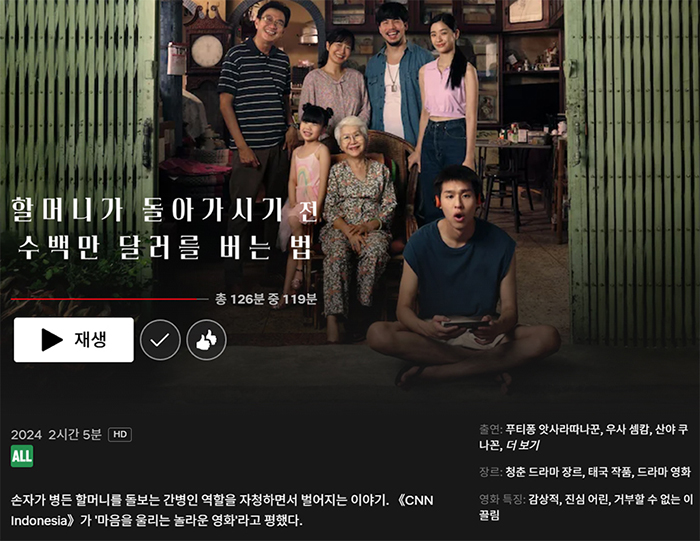 할머니가 죽기 전 백만장자 되는 법은 넷플릭스에서만 서비스되는 영화는 아니지만 작품 설명에서 볼 수 있듯이 '손자가 병든 할머니를 돌보는 간병인 역할을 자청하면서 벌어지는 이야기'다.