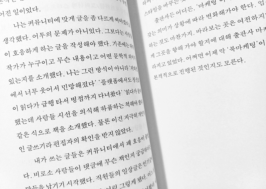 그래서 보통 소설을 다루는 문학동네 책은 읽을 일이 드물지만, 솔직히 이 책은 문학동네 마케터는 어떻게 글을 쓰고 어떤 글을 쓰는지 궁금해서 읽은 게 컸다.