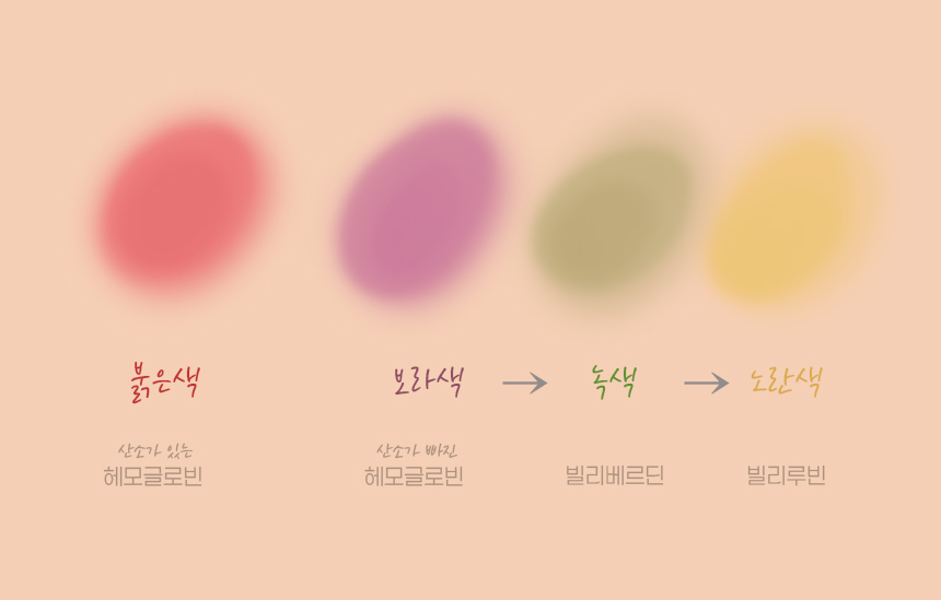 나중: 녹색 → 노란색 (분해산물인 빌리베르딘, 빌리루빈)