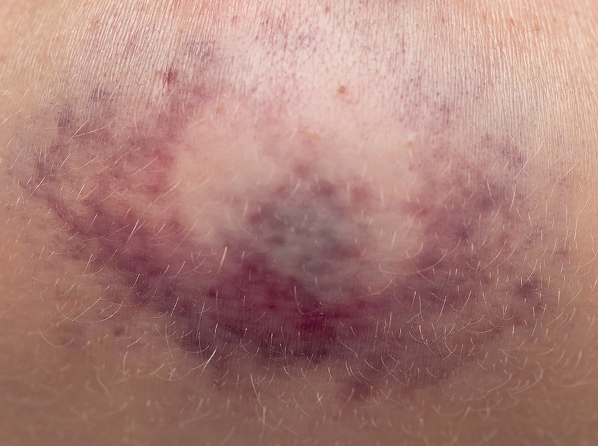 신체에 가해진 충격으로 터진 모세혈관에서 흘러나온 피가 피부 아래에 고인 상태를 의미.