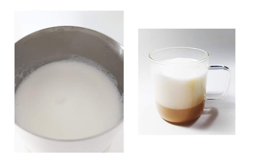 스팀으로 공기를 미세하게 섞는 카페의 라떼와 달리 밀크프로더는 회전으로 공기를 넣기 때문에 거품이 더 단단하고 기포가 굵기 때문이다.