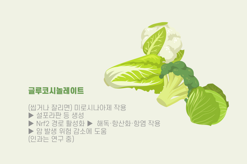 글루코시놀레이트는 배추과 채소에 들어 있는 황 함유 식물성 화합물로, 채소를 씹거나 썰 때 세포가 파괴되면 미로시나아제 효소에 의해 분해되어 설포라판, 인돌-3-카비놀, 이소티오시안산 등 다양한 생리활성 물질로 전환된다.