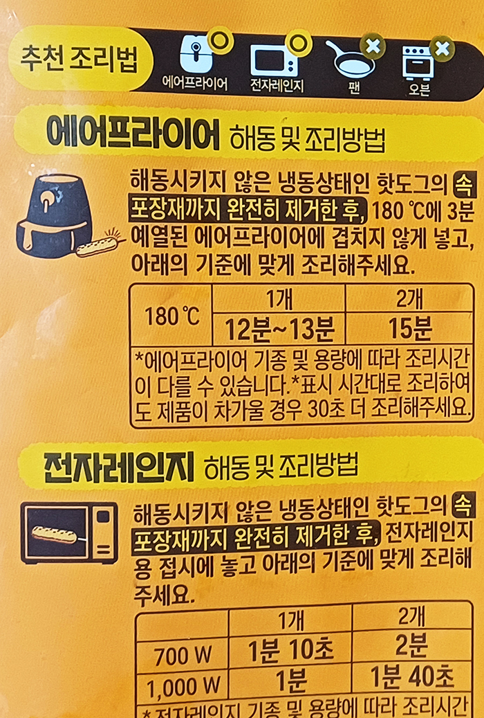 그래서 조금 더 꾸덕하고 촉촉한 느낌의 핫도그로 먹고 싶다면 에어프라이어에 조리 후 전자레인지에 돌려주면 더 맛있게 먹을 수 있지 않을까 싶다.