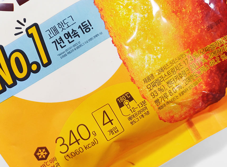 고메 치즈 크리스피 핫도그는 총 4개입에 에어프라이어, 전자레인지 조리 가능하다.