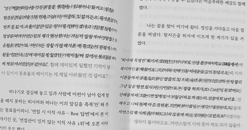 일문일답의 형식을 벗어나 인터뷰어의 시선과 감정이 전면에 등장하며, 때로는 흐릿하게 겹치거나 먹칠된 문장들이 관계의 불완전함을 시각적으로 드러낸다.