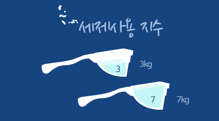 세제 사용지수는 1회 세탁량에 필요한 적정 세제 사용량을 나타내는 표준지수로 숫자 3과 7로 표시된다.