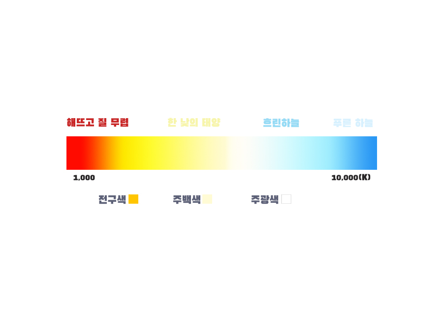 켈빈 K 값이 높을수록 하얀 빛에 가깝고 낮을수록 주황 빛에 가깝다.