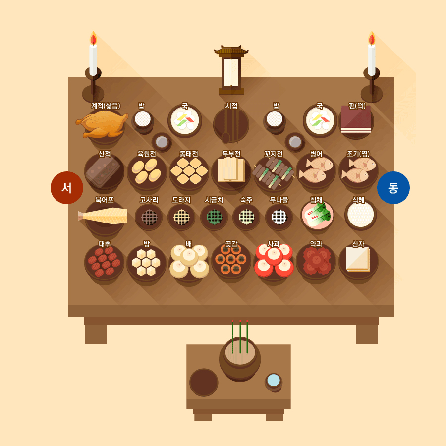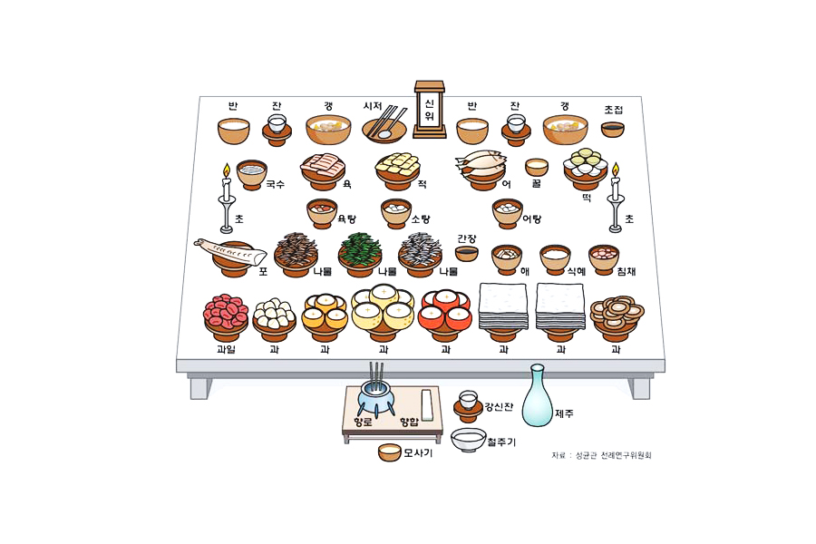 제사상은 보통 5열로 차리며 신위 기준(북쪽)으로 1열은 밥과 국, 2열은 전과 구이, 3열은 탕, 4열에는 나물과 포, 5열에는 과일 등 후식에 해당하는 것들을 올린다.