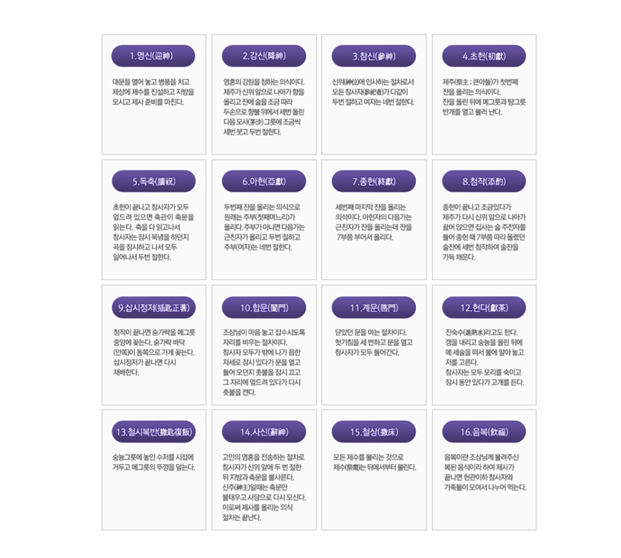 아울러 전통 제례절차도 서울시설공단 사이트에서 참고할 수 있는데 제례 절차는 다음과 같다.