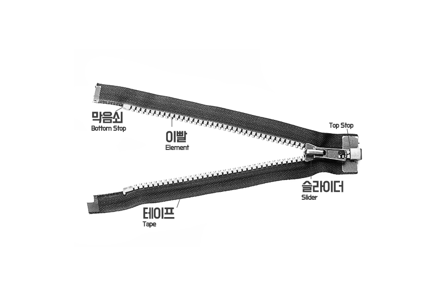 지퍼의 구조는 슬라이더, 이빨(이), 테이프(띠), 막음쇠 등으로 구성되어 있다.