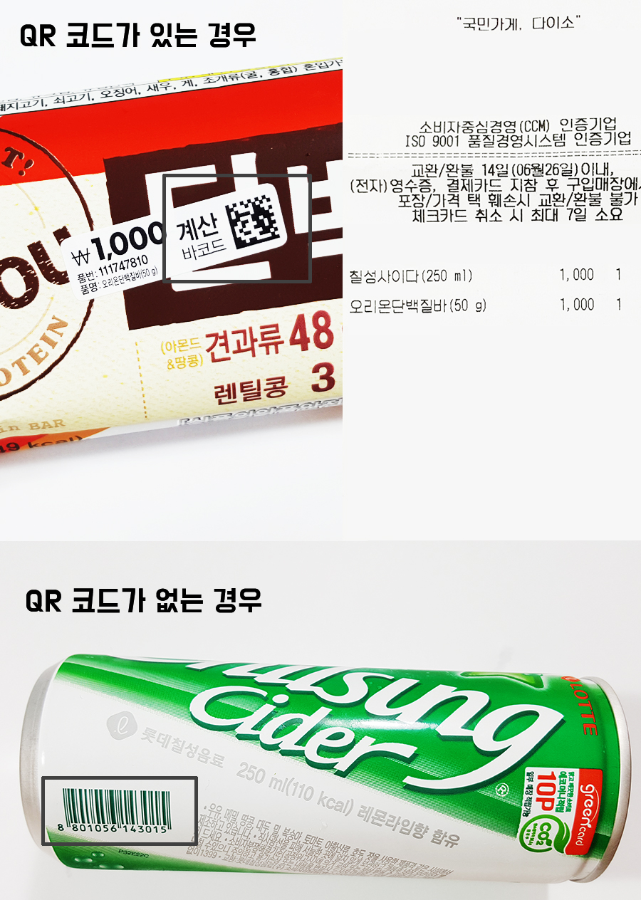 일반적으로 무인 계산시 상품에 있는 직선의 바코드를 찍어 계산하는 경우가 많지만 다이소 같은 경우는 상품의 QR 코드를 찍어야 한다. 흔히 볼 수 있는 상품의 기존 바코드에 비해 QR 코드는 네모낳고 작게 생겼다.