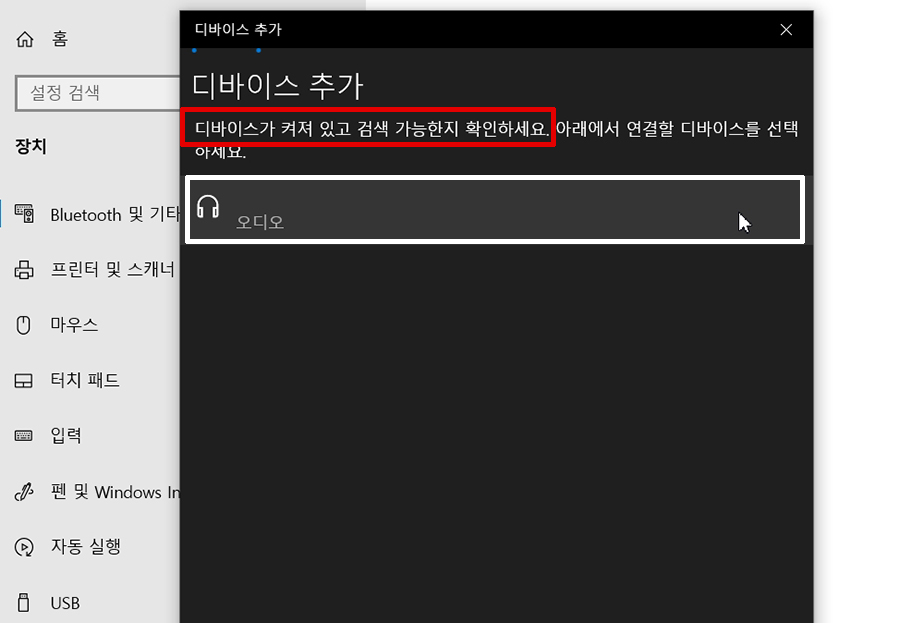 창의 "디바이스가 켜져 있고 검색 가능한지 확인하세요"의 메시지처럼 이때 각각의 이어폰 및 블루투스 장치는 연결될 수 있게 미리 설정해줘야 한다. 그것은 각각의 이어폰 장치에 설명에 따르도록 한다.